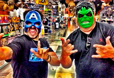 Caio Castro visitou uma loja de brinquedos acompanhado de seu pai nesta quarta-feira (11). Fazendo pose para foto, os dois se divertiram e vestiram máscaras de super-heróis. O ator escreveu: